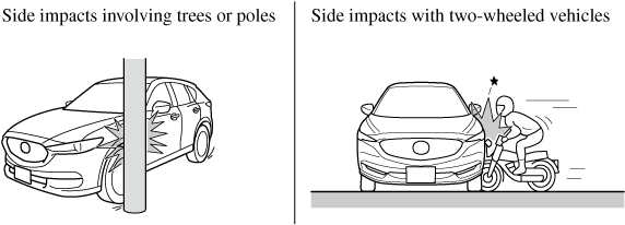 The following illustrations are examples of side collisions that may not be detected as severe enough to deploy the SRS air bag equipment.