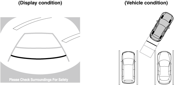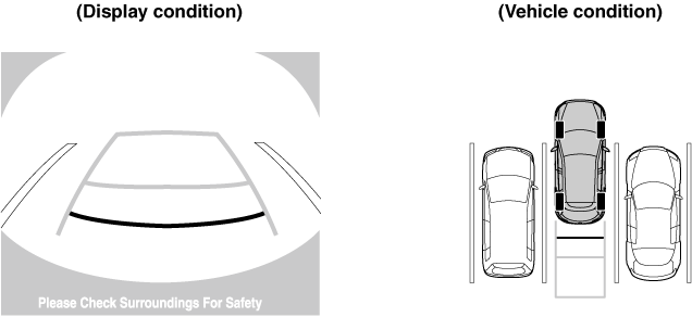 Because there may be a difference between the displayed image, such as indicated below, and the actual conditions when parking, always verify the safety at the rear of the vehicle and the surrounding area directly with your eyes.