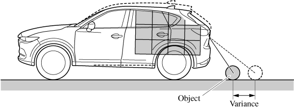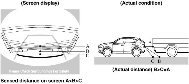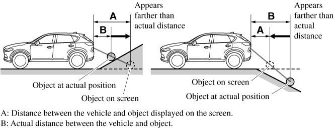 When there is a steep upgrade (downgrade) behind the vehicle, the object displayed on the screen appears farther (downgrade: closer) than the actual distance.