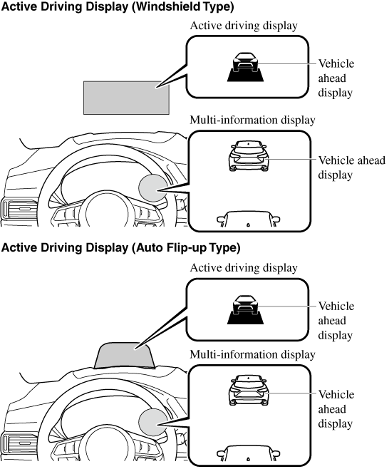 The Distance Recognition Support System (DRSS) operation status is indicated in the active driving display or multi-information display. Regarding malfunctions, check the vehicle conditions or have it inspected by an Authorized Mazda Dealer according to the content of the displayed message.