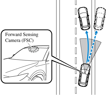 The Forward Sensing Camera (FSC) detects the white lines (yellow lines) of the vehicle lane in which the vehicle is traveling and if the system determines that the vehicle may deviate from its lane, it operates the electric power steering to assist the driver's steering operation. The system also alerts the driver by activating a lane departure warning sound, vibrating the steering wheel, and indicating an alert in the display.
