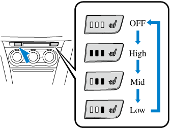 Press the seat warmer switch while the ignition is switched ON to operate the seat warmer. The indicator lights turn on to indicate that the seat warmer is operating. The mode changes as follows each time the seat warmer switch is pressed.