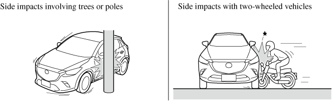 The following illustrations are examples of side collisions that may not be detected as severe enough to deploy the SRS air bag equipment.