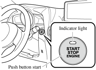 If the KEY warning light (red) illuminates, or the push button start indicator light (amber) flashes, this could indicate that the engine may not start using the usual starting method. Have your vehicle inspected at an Authorized Mazda Dealer as soon as possible. If this occurs, the engine can be force-started. Press and hold the push button start until the engine starts. Other procedures necessary for starting the engine, such as having the key in the cabin, and depressing the clutch pedal (manual transaxle) or the brake pedal (automatic transaxle) are required.