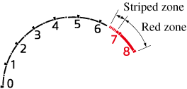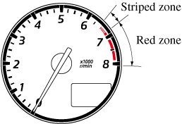 When the tachometer needle enters the STRIPED ZONE, this indicates to the driver that the gears should be shifted before entering the RED ZONE.