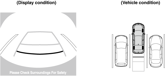 Because there may be a difference between the displayed image, such as indicated below, and the actual conditions when parking, always verify the safety at the rear of the vehicle and the surrounding area directly with your eyes.
