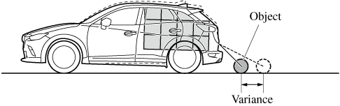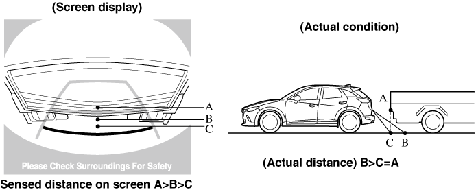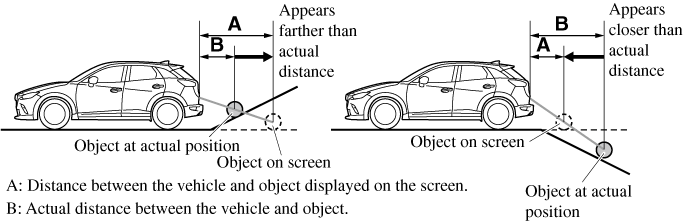 When there is a steep upgrade (downgrade) behind the vehicle, the object displayed on the screen appears farther (downgrade: closer) than the actual distance.