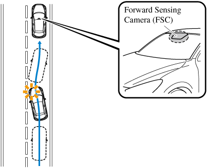 The system detects the white or yellow lines on the traffic lane using the Forward Sensing Camera (FSC) and if it determines that the vehicle may be deviating from its lane, it notifies the driver using the active driving display (vehicles with active driving display), and by flashing the LDWS warning light and activating the LDWS warning beep.