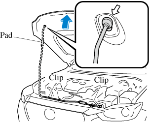 Grasp the support rod in the padded area and secure it in the support rod hole indicated by the arrow to hold the hood open.