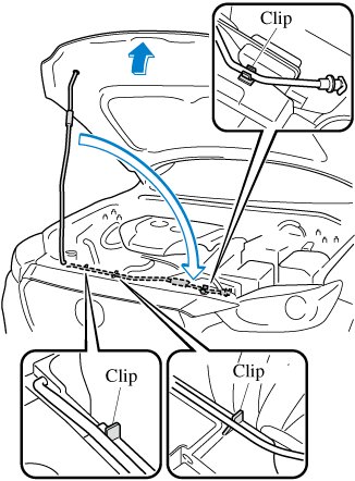 Lift the hood, grasp the padded area on the support rod, and secure the support rod in the clip. Verify that the support rod is secured in the clip before closing the hood.