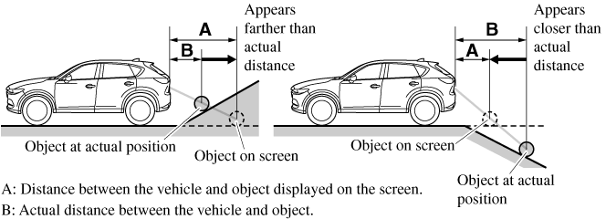When there is a steep upgrade (downgrade) behind the vehicle, the object displayed on the screen appears farther (downgrade: closer) than the actual distance.