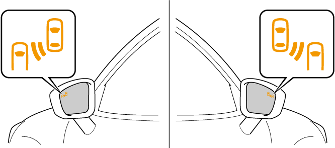 The BSM detects vehicles approaching from the rear and turns on the BSM warning indicator lights equipped on the door mirrors according to the conditions. Additionally, while a BSM warning indicator light is illuminated, if the turn signal lever is operated to signal a turn in the direction in which the BSM warning indicator light is illuminated, the BSM warning indicator light flashes.