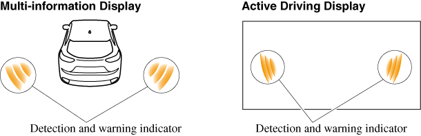 The detected approaching vehicle and warning are displayed in the multi-information display and active driving display when the vehicle is moving forward (BSM operational).