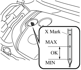 Inspect the engine oil level periodically. When inspecting the engine oil, if the engine oil level is exceeds the “X” mark on the dipstick, replace the engine oil. This should be done by an Authorized Mazda Dealer. When replacing the engine oil, inspect the oil level using the oil dipstick and refill so that the engine oil level is within the range between MIN and MAX as shown in the figure.