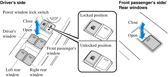 The front passenger's side and rear windows can be opened/closed when the power window lock switch on the driver's door is in the unlock position. Keep this switch in the locked position while children are in the vehicle.