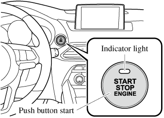 If the KEY warning light (red) illuminates, or the push button start indicator light (amber) flashes, this could indicate that the engine may not start using the usual starting method (for vehicles with a type A instrument cluster (Search), messages are displayed in the instrument cluster). Have your vehicle inspected at an Authorized Mazda Dealer as soon as possible. If this occurs, the engine can be force-started. Press and hold the push button start until the engine starts. Other procedures necessary for starting the engine, such as having the key in the cabin, and depressing the brake pedal are required.