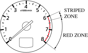 When the tachometer needle enters the STRIPED ZONE, this indicates to the driver that the gears should be shifted before entering the RED ZONE.