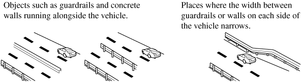 The BSM warning indicator light may turn on and the vehicle detection screen may be displayed in the display in reaction to stationary objects (guardrails, tunnels, sidewalls, and parked vehicles) on the road or the roadside.