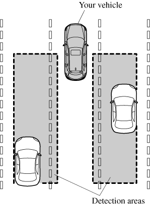 The detection area on this system covers the driving lanes on both sides of the vehicle and from the rear part of the front doors to about 50 m (164 ft) behind the vehicle.
