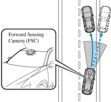 The Forward Sensing Camera (FSC) detects the white lines (yellow lines) of the vehicle lane in which the vehicle is traveling and if the system determines that the vehicle may deviate from its lane, it operates the electric power steering to assist the driver's steering operation. The system also alerts the driver by activating a lane departure warning sound, vibrating the steering wheel, and indicating an alert in the display. Use the system when you drive the vehicle on roads with white (yellow) lines such as expressways and highways.