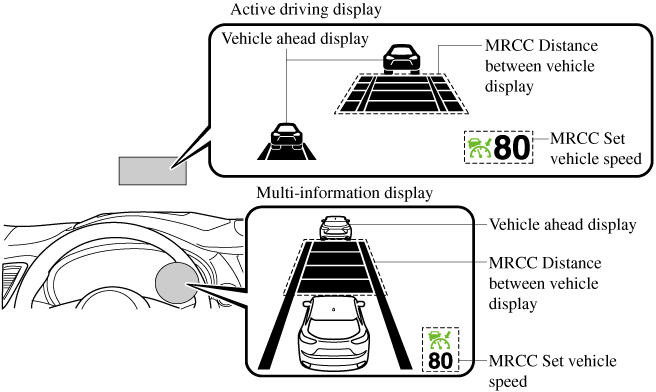 The MRCC with Stop & Go function setting status and operation conditions are indicated on the multi-information display and the active driving display.