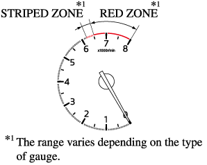 When the tachometer needle enters the STRIPED ZONE, this indicates to the driver that the gears should be shifted before entering the RED ZONE.