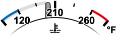 During normal driving, the engine coolant temperature stabilizes at 100 °C (210 °F) or less, and the gauge indicates a range lower than 100 °C (210 °F).