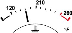 During normal driving, the engine coolant temperature stabilizes at 100 °C (210 °F) or less, and the gauge indicates a range lower than 100 °C (210 °F).