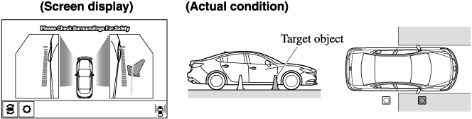 The parking sensor detection range has limitations. For example, obstructions closing in from the side and objects short in height may not be detected. Always confirm the safety around the vehicle visually when driving.