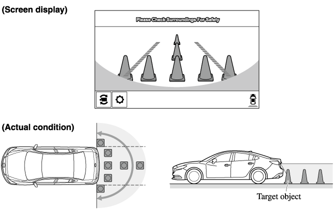 The parking sensor obstruction detection indication does not display. Switch the screen display to the top view/rear view display if the parking sensor warning sound is activated.