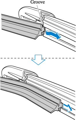 After pulling the blade rubber in the direction of the arrow and sliding the blade rubber to a position to check the blade holder groove, slide the blade rubber end in the opposite direction.