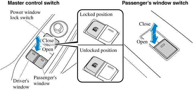 The passenger windows may be opened or closed using the master control switches on the driver's door.