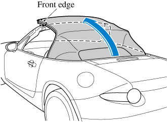 Standing outside of the vehicle, hold the convertible top along the front edge and pull it towards the vehicle front.