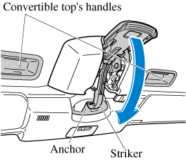 The convertible top may be constricted if it is left retracted for a long period. Therefore, if the top has become constricted, it may be difficult to hook the top latch striker to the anchor.