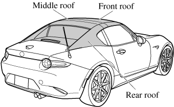 The retractable hardtop opens/closes electrically by operating switches in the vehicle. When opening/closing the roof and window glass operate together. The front roof is stored in the storage area under rear roof.