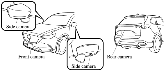 Your vehicle is equipped with a front camera, side cameras, and a rear camera. The 360° View Monitor uses each camera.