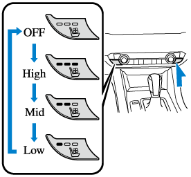 Press the seat ventilation switch while the ignition is switched ON to operate the seat ventilation. The indicator lights turn on to indicate that the seat ventilation is operating. The mode changes as follows each time the seat ventilation switch is pressed.