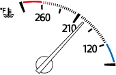 During normal driving, the engine coolant temperature stabilizes at 100 °C (210 °F) or less, and the gauge indicates a range lower than 100 °C (210 °F).