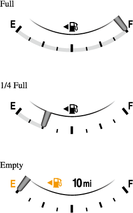 The fuel gauge shows approximately how much fuel is remaining in the tank when the ignition is switched ON. We recommend keeping the tank over 1/4 full.