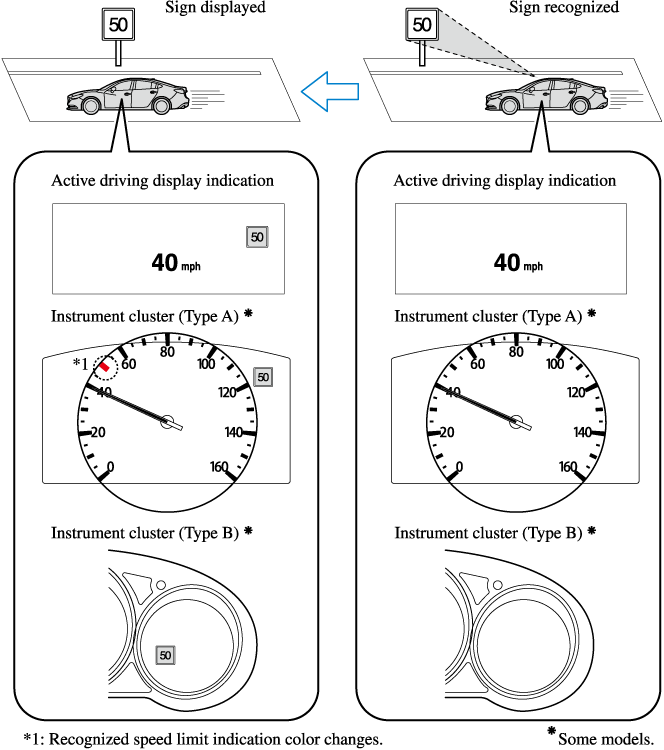 If the vehicle speed exceeds the speed limit sign indicated in the active driving display/instrument cluster while the vehicle is driven, the system notifies the driver using the indication in the active driving display/instrument cluster and a warning sound.