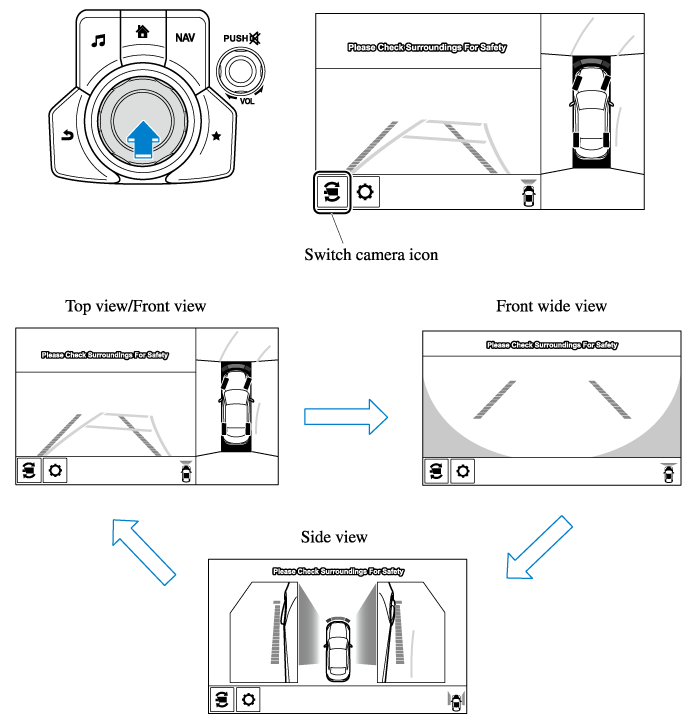 You can change the displayed screen by pressing the commander knob or by touching the switch camera icon on the screen while the top view/front view, front wide view, or the side view is displayed.