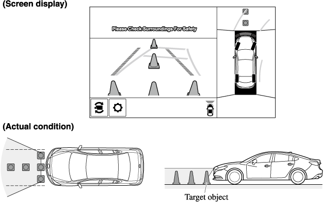 The parking sensor detection range has limitations. For example, obstructions closing in from the side and objects short in height may not be detected. Always confirm the safety around the vehicle visually when driving.