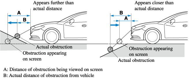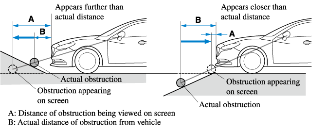 If the vehicle is on a slope, obstructions taken by the camera can appear farther or closer than the actual distance from the vehicle.