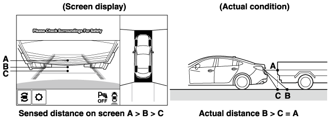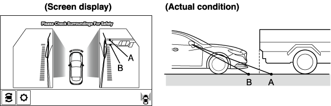 Because the vehicle front end guide lines (side camera) or the distance guide lines (rear camera) are displayed based on a flat surface, the distance to the three-dimensional object displayed on the screen is different from the actual distance.
