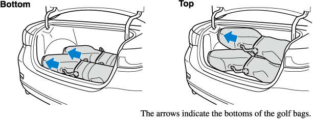 Bottom: Place the first and second golf bags in the trunk with the bottoms pointed to the left.