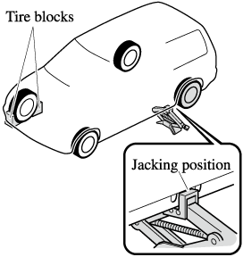 When jacking-up a vehicle, always shift the shift lever to 1st or R position (manual transaxle vehicle) or shift the selector lever to P position (automatic transaxle vehicle), apply the parking brake, and place wheel blocks in the position diagonally opposed to the jack:
