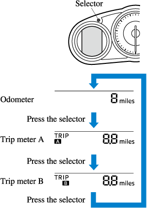 The display mode can be changed from odometer to trip meter A to trip meter B and then back to odometer by pressing the selector while one of them is displayed. The selected mode will be displayed.