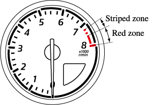 When the tachometer needle enters the STRIPED ZONE, this indicates to the driver that the gears should be shifted before entering the RED ZONE.