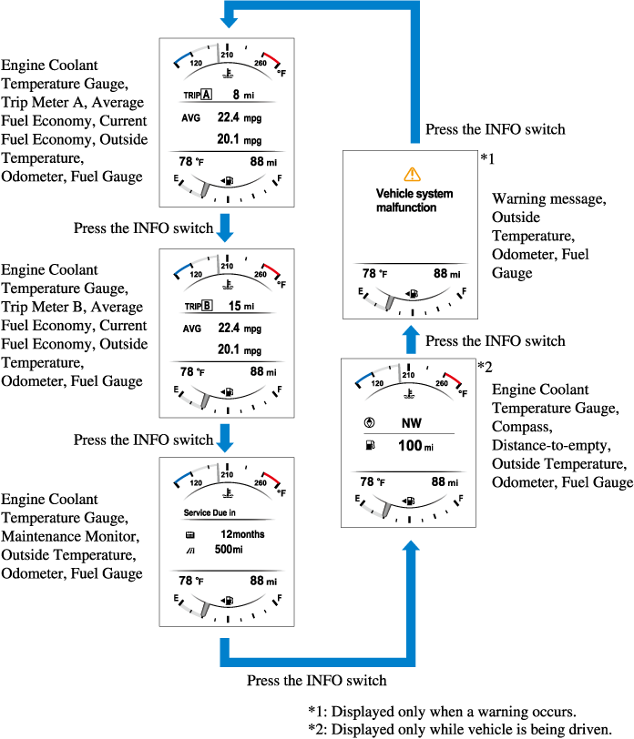 The screen content changes each time the INFO switch is pressed.