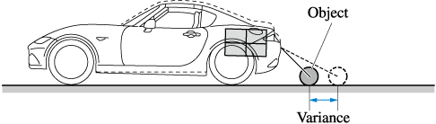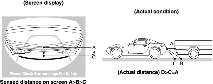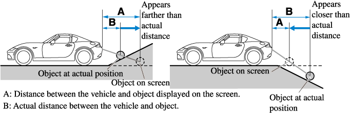 When there is a steep upgrade (downgrade) behind the vehicle, the object displayed on the screen appears farther (downgrade: closer) than the actual distance.
